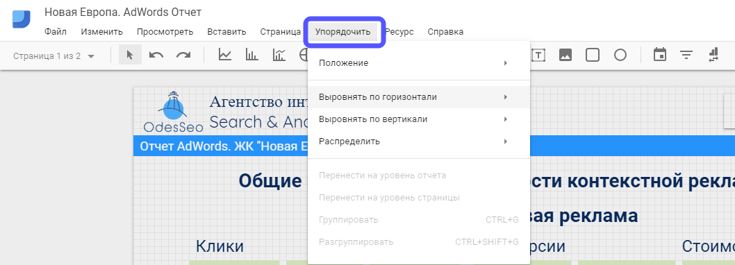 Раздел “упорядочить”, как ни странно, позволяет упорядочить элементы в отчете, выровнять, перенести на необходимый вам уровень отчета и пр.