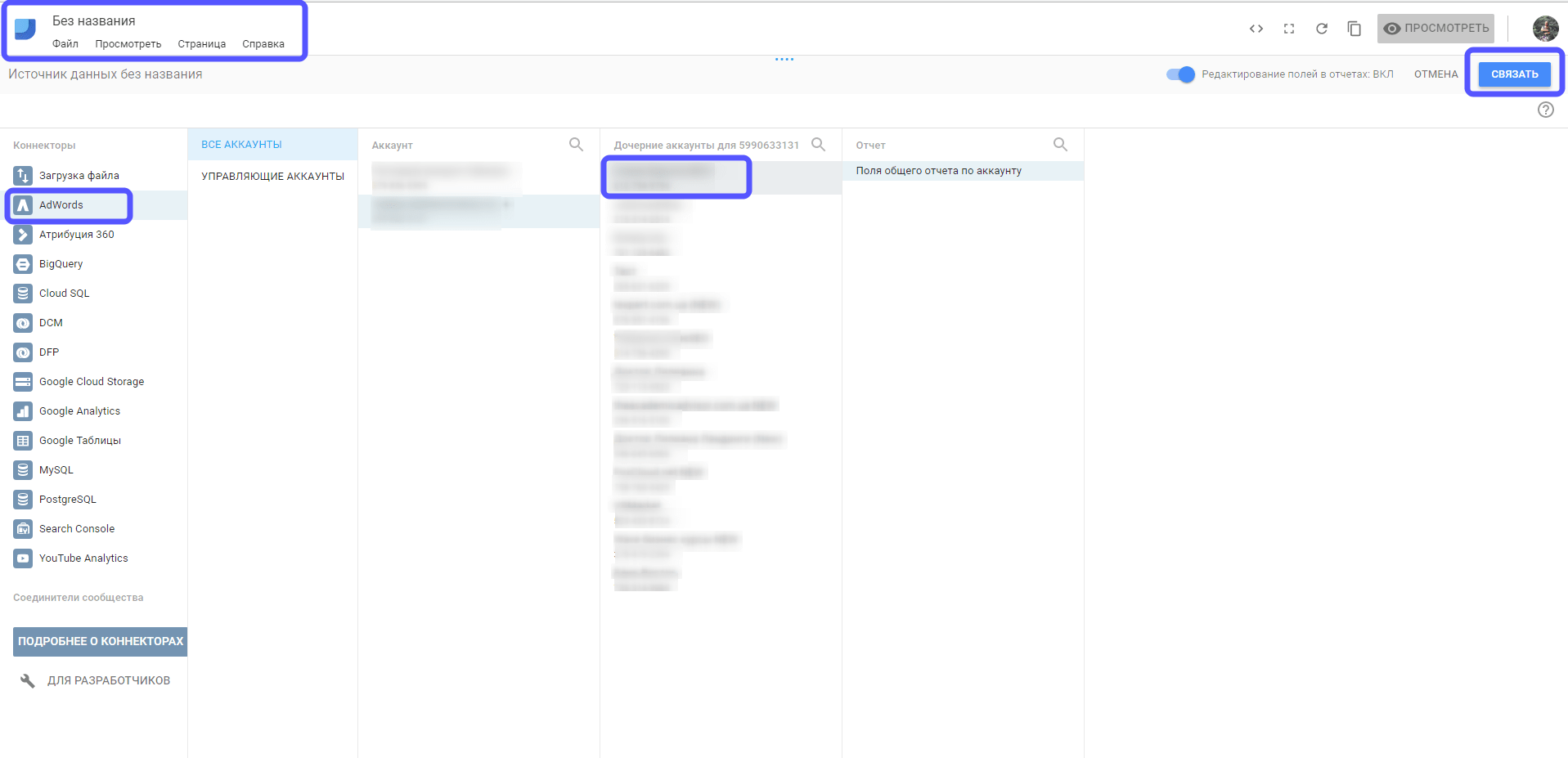 К примеру, вы решили, что вам необходимы данные не из системы Ads, а из Analytics, карандаш станет отличным помощником в этом вопросе. Нажав на него, вам потребуется лишь выбрать новый источник данных и подключить его с помощью синей кнопки.